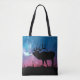 This image is a silhouette of a Bull with the night sky on an all over print Tote