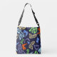 Bolso bandolera azul con estampado integral con patrón de fantasía con elementos botánicos y formas abstractas, donde los elfos y sus máscaras se mezclan entre el aleteo de las mariposas