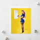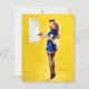 Elvgren Pin Up Girl Art. A woman dressed in a retro-style waitress outfit holds a tray with a steaming cup and a pastry, set against a bright yellow backdrop. Her attire includes a blue dress, stockings, and a small white apron, embodying a vintage aesthetic.