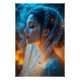 A dreamy, magical profile portrait of a serene woman with eyes gently closed and glossy red lips. She is illuminated by dual lighting: warm orange radiance rising from below and cool blue tones descending from above, casting a dramatic yet peaceful glow across her features. Draped over her head is a sheer, glowing blue veil that shimmers and catches the ethereal light. The atmosphere is alive with tiny gold and blue sparkles floating in the air, intertwining with delicate curls of smoke. Behind her, a soft-focus background glows faintly with orange embers, adding warmth to the mystical ambiance. The portrait is highly detailed and photorealistic, with a touch of fantastical charm.