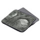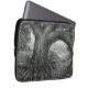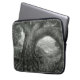 A detailed charcoal drawing by Amanda Diehl features a large, old tree growing bent over the edge of a cliff in the foreground. The tree's trunk and roots are prominently displayed, with intricate textures and patterns. Through a natural arch formed by the tree's branches, a landscape with hills, vegetation, and a cloudy sky is visible. Several birds are flying in the distance.