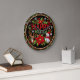 This richly detailed clock gives the illusion of being an intricate embroidery or needlework piece on a black background. It features the bold text "HAPPY HOLIDAYS" surrounded by a festive arrangement of pines, red berries, a reindeer, a snowman in a Santa hat, and large red poinsettia flowers. The entire design is framed by a highly detailed, golden-threaded garland. The design may look real due to the high detail and three-dimensional texture in the artwork.