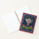 Elevate your tea time with the "Magical Brews" journal. The cover features a delightful faux-embroidery illustration of a large, floral-patterned teapot acting as a hot air balloon. The teapot is decorated with vibrant "hand-stitched" pink roses and yellow wildflowers, complete with glowing fairy lights wrapped around its handle and spout. Below the balloon, two tiny white bunnies peek out from a wicker basket as they float over a magical village of polka-dot mushroom houses nestled on a beaded green hillside. The design is framed by a sophisticated, multi-layered swirling border in blue, purple, and pink, accented with golden stars. Set against a deep navy linen-textured background, this piece radiates a cozy, nighttime magic.