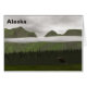 A digital painting of green conifer trees and mountains in Alaska on a very grey and cloudy day. A bull moose in the foreground lends scale to the scene. Text reading "Alaska" also appears.