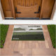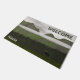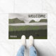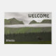 A "primitive" or folk style digital painting of green conifer trees and mountains in Alaska on a very grey and cloudy day. A bull moose (Alces alces) in the foreground lends scale to the scene. There are two instances of customisable text reading, "Alaska" and "WELCOME".