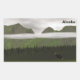 A digital painting of green conifer trees and mountains in Alaska on a very grey and cloudy day. A bull moose in the foreground lends scale to the scene. Text reading "Alaska" also appears.
