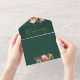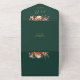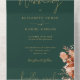 All-in-one wedding invitation featuring rustic florals and elegant gold typography on an emerald green background. The invitation includes a perforated RSVP card with your wedding website QR code. Designed by Thisisnotme©