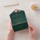 All-in-one wedding invitation featuring elegant gold typography on an emerald green background. The invitation includes a perforated RSVP card with your wedding website QR code and details. Designed by Thisisnotme©