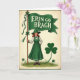 Designed with a classic poster look, the card shows a smiling young woman in a rich green dress standing on a small patch of grass, her posture proud yet friendly 💚. She wears a wide-brimmed green hat over softly curled red hair, with a white blouse and a small green bow that draws your eye to her calm, inviting face. In her hands, she holds a tall wooden pole topped with a flowing emerald banner that stretches above her like a canopy. Across the banner, the words “ERIN GO BRAGH” sit in white lettering, centered and easy to read against the deep green. A large shamrock with a long, curling stem rises on her right side, while tiny three-leaf clovers sprinkle the ground around her ☘️. The warm cream background and dark green border frame the scene, giving it a cozy, old-fashioned feel, like a keepsake you’d pass to a close friend. Small ribbons tied near the top of the pole and the neat folds in her skirt add fine detail against the cream backdrop and green frame.