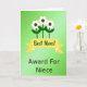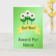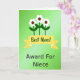 This card features a bright green gradient background that shifts from light lime at the top into deeper emerald below, setting a cheerful scene. Three stylized flowers stand tall in the center with white petals around dark brown centers, their slim dark-green stems and simple leaves leaning close together like a small family huddle ❤️. A wide yellow banner stretches across the middle with folded ends and pointed tails, creating a spotlight for the main message. On that banner, the words “Best Mom!” are placed front and center in green lettering that matches the leafy tones behind it. Below the banner, “Award For Niece” sits as a smaller line in plain black letters, aligned neatly under the main phrase. The mix of a mom-focused headline with that unexpected second line adds a wink of family closeness, like an inside joke shared with a smile 🌼. The flowers appear to peek from behind the banner, with their petals overlapping slightly and the yellow ribbon cutting across the stems.