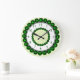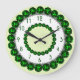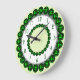 A beautifully elegant clock that features a print of not one but two circles of emeralds on a background of light green, white, and grey. Numbers are done in an elegant font and in a coordinating shade of dark green.