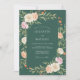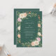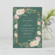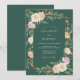 A rich emerald background creates a sophisticated canvas for delicate floral artistry. Soft peach and blush blooms intertwine with lush greenery, forming a charming border. This design evokes a romantic and elegant mood for a special celebration.