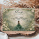 This elegant quinceañera design features a soft emerald green watercolor background framed by romantic ivory roses, delicate greenery, and subtle gold accents, with a graceful gown illustration creating a refined, enchanted garden atmosphere. The rich green palette combined with classic florals gives the design a luxurious yet youthful feel, perfect for a timeless quinceañera celebration with a romantic, nature-inspired aesthetic.