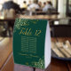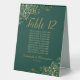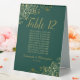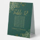These elegant emerald green and gold table tent signs will make it easy for your guests to find their seats, and also make your wedding reception more beautiful. The feature a simple design with a lacy script calligraphy title with the table number and space for the names of 10 guests. Below is space for the names of the couple and the wedding date. The corners are decorated with lacy floral curls and swirls. Great way to add a touch of formal class to your reception.