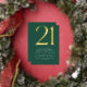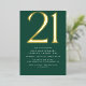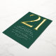 Modern minimal style 21st birthday invitations with a large heading "50" in real metallic foil. Your event details are printed below in matte white text. Unisex design with gold accents on dark green.