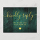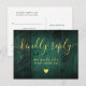 An emerald green rustic barn wood boho RSVP card with chic gold typography. The reverse features your details and a fun guest song request. Designed by Thisisnotme©