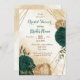 Beautiful bridal shower invitations featuring emerald green and beige gold flowers with green leaves .