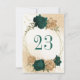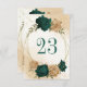 Beautiful fall wedding table number card featuring emerald green and beige gold flowers with green leaves .