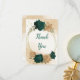 Beautiful wedding thank you card featuring emerald green and beige gold flowers with green leaves .