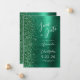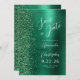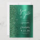 This elegant modern wedding save the date card features an emerald green brushed metal background decorated with faux diamond glitter. The customisable text combines white script and sans serif fonts. The reverse side repeats the emerald green brushed metal and glitter design.