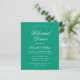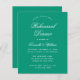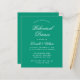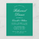 A simple rehearsal dinner invitation with a modern colour: emerald green. It has just white text on emerald background. The words "Rehearsal Dinner" and the name are written in an elegant calligraphic script.