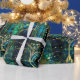 Elegant celestial emerald green tree faux stained glass pattern with gold accents with blue and green background
