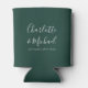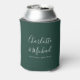 An elegant emerald green wedding favour can cooler featuring stylish signature script names and special date set in modern typography. Designed by Thisisnotme©