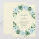 This elegant design features a sophisticated palette of emerald green and powder blue blooms against a creamy ivory backdrop. Lush roses and delicate hydrangea clusters are meticulously arranged with deep green foliage to create a timeless aesthetic. These botanical elements evoke a refined atmosphere perfect for a formal spring or winter event.