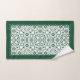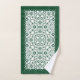 Emerald green and white damask pattern and scalloped borders Bath Towel Set. The bath towel features an elegant green and white damask pattern and bands on the short sides with scalloped edges. There is also a frame with your family name. The hand towel showcases a scalloped border around it while the wash cloth is in green colour in the centre with a damask border and your monogram. You can personalise it with your family name and monogram.