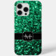 Emerald Green faux glitter sparkles Monogram iPhone 15 Case. Personalise Sparkly iPhone case with your initial and name. Beautiful girly glamourous shiny glitters sparkles. Photo of sparkles not actual glitter!