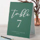 This solid emerald green wedding table number table tent sign features classic white script for a couple getting married in a forest or other nature venue. Celebrate your love with this tranquil colour and coordinate with our matching minimalist typography collection.