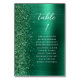 The left-hand edge of this elegant modern wedding table number card features an emerald green faux glitter border. The word "table" and the table number appear in white handwriting script on an emerald green faux brushed metal background. Add the names of your guests who are assigned to each table.