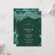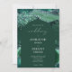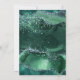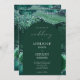 This invitation features an emerald green watercolor design in imitation of agate geodes trimmed with green faux foil and green and silver faux glitter. The text appears in white on a dark green arch shape, with the word "wedding" in decorative script. The back repeats the emerald green glitter agate design.