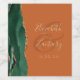 This modern wedding design features an emerald green watercolor agate and gold faux glitter border on the left edge. Personalise it with the couple's names in elegant gold-coloured handwriting script over a large ampersand on a burnt orange background, with the wedding date below.