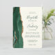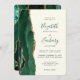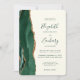 The left-hand edge of this elegant modern wedding invitation features an emerald green watercolor agate border trimmed with faux gold glitter. The customisable text combines green handwriting, copperplate and italic fonts on an ivory background. The reverse side features a matching emerald green and gold agate design.
