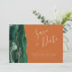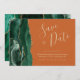 This elegant modern save the date card features an emerald green watercolor agate border trimmed with faux gold glitter. The customisable text combines gold-coloured handwriting script, copperplate and italic fonts on a burnt orange or rust background. The reverse side features a matching emerald green and gold agate design.