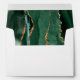 The inside of this elegant modern wedding invitation envelope features an emerald green watercolor agate design trimmed with faux gold glitter. Customise the back flap with the names of the bride and groom in charcoal grey handwriting script and return address in copperplate font on a white background.