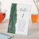 The left-hand edge of this elegant modern wedding table number pedestal features an emerald green watercolor agate border trimmed with faux gold glitter. The word "table" appears in whimsical charcoal grey script on a white background. Add the names of your guests who are assigned to each table.