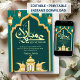 This elegant template features a prominent golden Islamic arch over a deep emerald green geometric background. Decorated with traditional lanterns and crescent moons, it is ideal for Eid invitations or formal holiday cards.