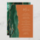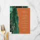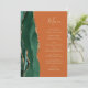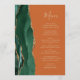 The left-hand edge of this elegant modern wedding menu features an emerald green watercolor agate border trimmed with faux gold glitter. The customisable text combines gold-coloured whimsical handwriting script and copperplate fonts on a burnt orange background. The reverse side features a matching emerald green and gold agate design.