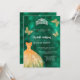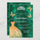 A modern, stylish and glamourous invitation for a Quinceañera, 15th birthday party. A studded emerald green background with a faux gold a dress, a faux silver tiara and golden butterflies. The name is written with a modern hand lettered style script. Personalise and add your party details.