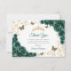 Emerald green gold Quinceanera celebration thank you card. Features, script font, butterflies, watercolor roses and tiara. Perfect for an elegant princess style glam celebration. Personalize with your own details.