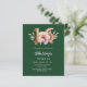 A modern, stylish and glamourous invitation for a Sweet 16. Emerald green background, decorated with a pink, peach and purple watercolored flower. The name is written with a modern dark rose gold coloured hand lettered style script. Personalise and add your party details. Number 16 is written with a balloon style font, script.