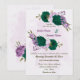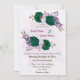 Beautiful romantic wedding invitations featuring emerald green and purple flowers and some leaves .
