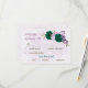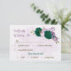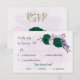 Beautiful romantic wedding response card featuring emerald green and purple flowers and some leaves .
