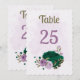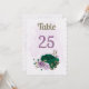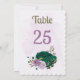 Beautiful romantic table number card featuring emerald green and purple flowers and some leaves .