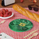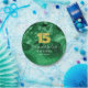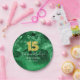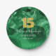 Celebrate your elegant green Quinceañera with a personalised green paper plate. Glitzy gold glitter number 15 is beautiful over green roses background. Elegant green Quinceanera custom party plate is versatile for jade, emerald, teal green, or St. Patrick party themes.