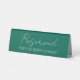 Reserve a wedding reception table for the bride's family with this table tent sign that is an emerald green colour with white, stylised script. Printing is on one side only.