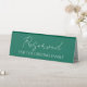 Reserve a wedding reception table for the groom's family with this table tent sign that is an emerald green colour with white, stylised script. Printing is on one side only.