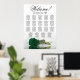 Enhance the elegance, sophistication, and charm of your wedding reception with this exquisite seating chart. This stunning contemporary floral design showcases a romantic long-stemmed emerald green rose resting horizontally and reflecting in a serene water pool. It can accommodate up to 190 guests, seated at 19 tables with 10 seats per table. The graceful calligraphy title states "Welcome! Please find your table" with room for the couple's names and wedding date at the bottom.